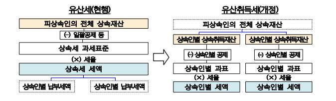 현행 유산세 방식에서는 피상속인의 전체 재산이 과세 대상이지만, 개정안에서는 상속인이 개별적으로 취득한 재산만을 기준으로 과세하게 됩니다.